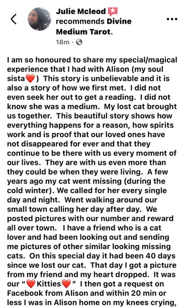 She is currently on tour with Psychic Fairs across Ontario. You can read Alison’s rave reviews on her Facebook page Divine Medium Tarot.